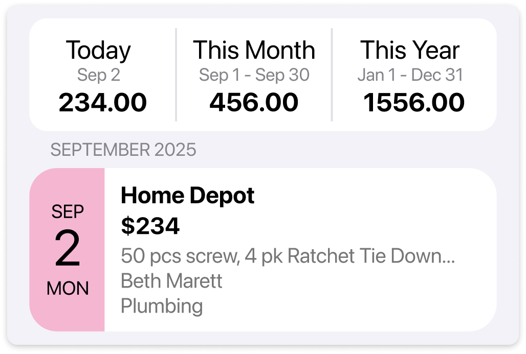All of your expenses are neatly organized and viewable by day, month, or year, so you can quickly understand your cash flow and stay on top of your budget. Whether you’re preparing for tax season or just want a clear picture of spending, everything you need is right at your fingertips.