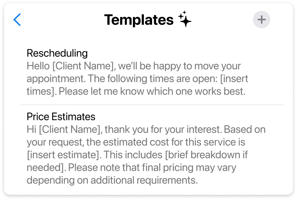 Save time with AI-generated templates for common messages like scheduling, rescheduling, estimates, and status updates. Each template is pre-written and fully editable, so you can quickly fill in details and send polished, professional replies without retyping the same messages over and over.