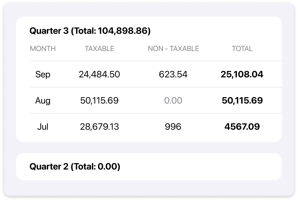 View your income reports quarterly, with a clear breakdown of taxable vs. non-taxable revenue. Choose between cash basis or accrual basis views to match your accounting style and get accurate insights into your business performance.
